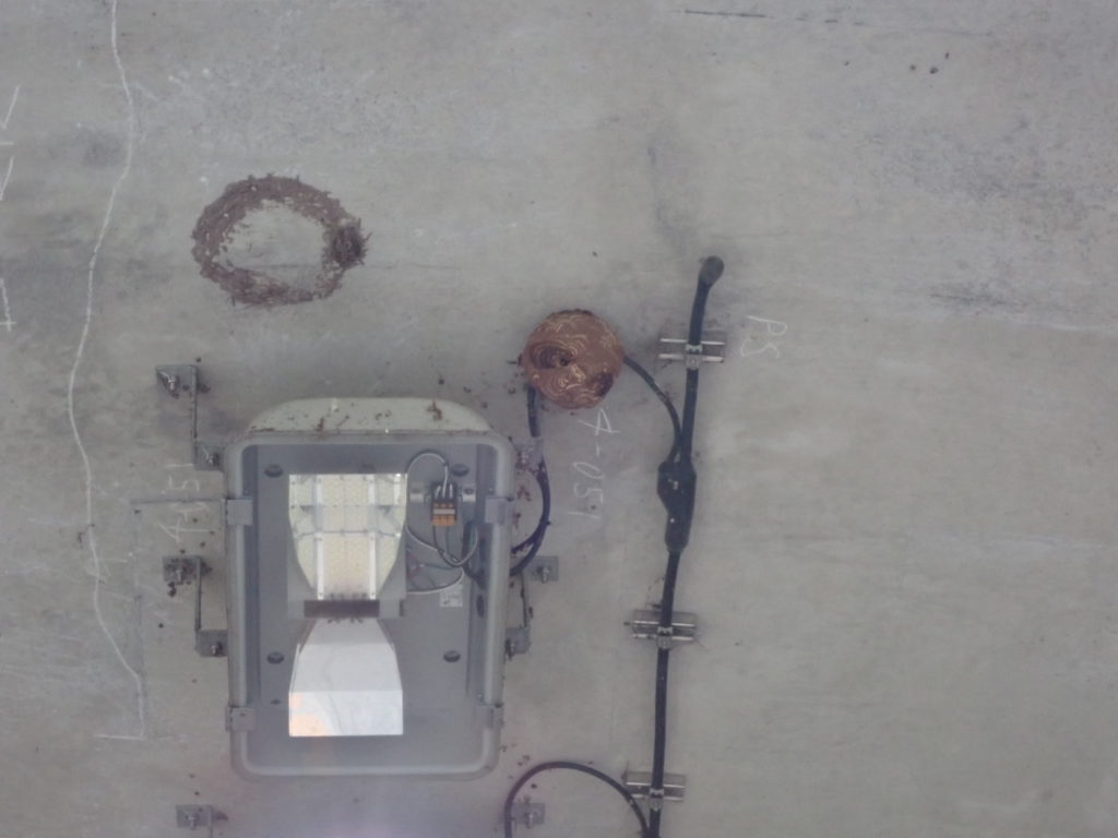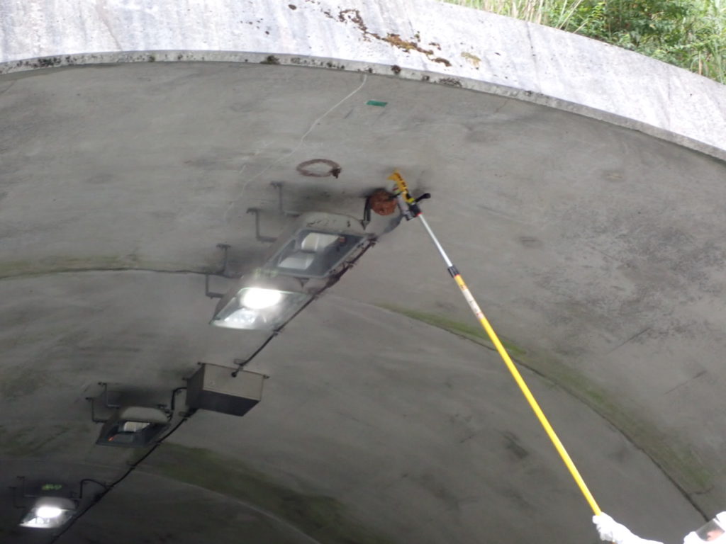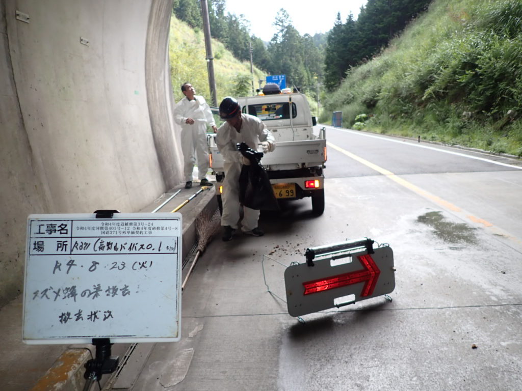 前日にひき続き、8月24日もスズメバチバスター活躍!今回は毎年のように作られるトンネル出入り口の巣。まだ小さいので今が撤去のナイスタイミングです。古田さんの自家用の荷台が上下する非常に便利な軽トラを使用し、無事に撤去をいたしました。高所での噴射が可能な器具と除去スプレーを用いてマニュアル通り、先に巣に出入りするスズメバチを駆除。そのあと柄の長い先に鍬の形状をした専用の器具で巣を除去。トンネル出入り口ということもあり通行車両にかなり気を使いましたが。古田さんの便利な軽トラでスムーズに撤去が完了しました。今後秋にかけて巣が増大する可能性が高いので、巣が小さいうちに撤去するためにも道路標識裏側にトンネル出入り口には日々チェックしていきたいと思います。